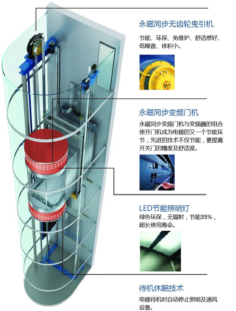 市场上目前也有无需挖底坑和自带井道螺杆式观光电梯,设计简约美观,此类电梯在土建上没有特别要求,对顶层高度几乎无限制,在高层建筑的复式楼,复式公寓,均可安装,且安装时间短。